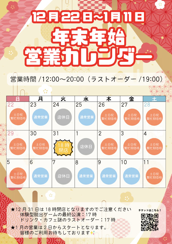 営業カレンダー2025年1月 2024 12/31 2025年は1月2日より営業いたします。 営業時間 12:00-20:00 当日券の受付は 1/2.3は11:00から道頓堀店なんば店の両店舗で受け付けております。 1/4.5は10:00からなんば店で受付ております。 お知らせ